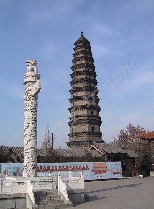 七寶塔在山西平順縣城西北23公里大云寺前。周顯德元年(公元 954年)建。通體用堅硬青石雕造。原為七層,現(xiàn)存五層,高為六米。下三層平面八角形。第一層雕寶裝蓮花、獅子、麒麟、飛馬等。第二層雕伎樂人,體態(tài)輕盈,舞姿優(yōu)美,伴奏者栩栩如生。第三層轉(zhuǎn)角處雕絞龍柱,回旋盤繞。塔檐下飛鳳、飛仙、共命鳥等變化多姿。檐下周匝垂帳,正面券門上雙龍戲珠,門側(cè)侍立二天王。后面比丘半掩門。兩次間二力士分立左右。第四層周匝垂帳,前后有假板門。第五層上覆大圓蓋寶珠頂。此堪設(shè)計精巧,雕造頗佳,獨具匠心。