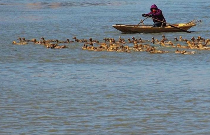 金風(fēng)送爽的秋天,正是湖上收獲的季節(jié)。漁舟來(lái)往穿梭,鸕鶿水下翻騰。喜看船艙中,不是活蹦亂跳的魚蝦,就是潔白似玉的白蓮藕和沉甸甸的香稻。湖區(qū)人民沉浸在豐收的喜悅之中。