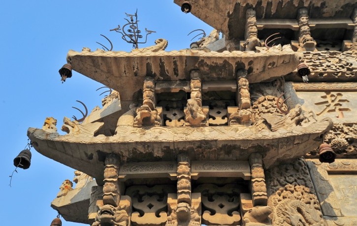 百壽坊俗稱朱家牌坊,位于單縣城內(nèi)勝利北街,乃清乾隆三十年(1765年)為翰林院孔目贈儒林郎朱叔琪妻孔氏而建,因雕有一百個不同書體的壽字而得名。坊以青色魚子狀石灰?guī)r構(gòu)成,通高l3米、寬8米,四柱三間三層樓閣式建筑。其獨特之處是:坊座雕有8頭矯健雄獅昂首遠望,8條出水蚊龍繞柱回舞,額枋上飾滿盛開牡丹,與正間上下額枋祥云間翩翩飛舞的5只透雕仙鶴、次間上額枋浮雕的相對翱翔之鸞鳳構(gòu)成了具有無窮魅力之藝術(shù)佳作,寓意福壽萬年、富貴無媲或喜上眉梢。