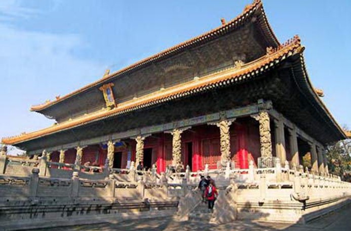 大成殿是孔廟的正殿,也是孔廟的核心。唐代時稱文宣王殿,共有五間。宋天禧五年(公元 102年)大修時,移今址并擴為七間。宋崇寧三年(公元1104年)徽宗趙佶取《孟子》:“孔子之謂集大成”語義,下詔更名為“大成殿”,清雍正二年(公元 1724年)重建,九脊重檐,黃瓦覆頂,雕梁畫棟,八斗藻井飾以金龍和璽彩圖,雙重飛檐正中豎匾上刻清雍正皇帝御書“大成殿”三個貼金大字。殿高 24.8米,長45.69米,寬24.85米,坐落在2.1米高的殿基上,為全廟最高建筑,也是中國三大古殿之一。