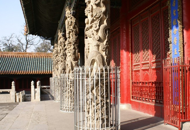 大成殿為孔廟之主殿,唐代稱“文宣王殿”。“大成”乃因宋徽宗趙倩尊孔子為“集古圣先賢之大成”而改名為“大成殿”,并御書匾額。大成殿不僅殿宇宏大,裝飾華麗,為全國孔廟之冠,而且此殿前檐十根雕龍石柱,龍姿飛揚,為宮殿建筑中前所未見,連紫禁城的龍柱也相形見細。據(jù)傳每當(dāng)皇帝前來祭孔時,要將龍柱用紅縷包裹起來,以免皇帝發(fā)現(xiàn),犯殺頭之罪。殿內(nèi)正中奉把孔子塑像,兩旁為四配和十二哲的塑像。殿前東西民廊原供孔門弟子及儒家歷代先賢,現(xiàn)已辟為陳列室,陳列著歷代碑刻,為書法、繪畫、雕刻的藝術(shù)寶庫。寢殿后的圣跡殿,藏有明代石刻連環(huán)畫120幅,記述了孔于的業(yè)跡。故宅井后的魯壁為秦始皇焚書坑儒時,孔子第九代孫孔鮑收藏《尚書》、《禮記》、《論語》、《孝經(jīng)》等的夾墻,人們?yōu)榱思o(jì)念孔鮑保護古代文化的功績,特地修建了這個魯壁。