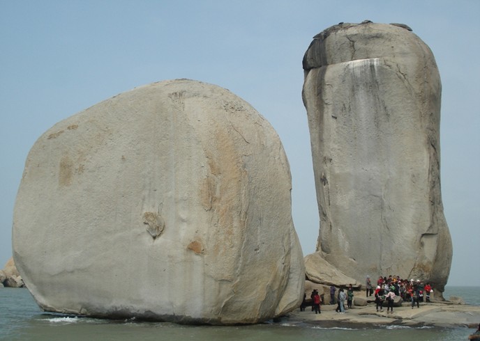 從看澳村岸邊坐渡船,十幾分鐘就到達礁石上,礁石底部是一組平坦完整的巖石。兩個石柱均由粗粒灰白色的花崗巖組成 東側的一個高達33米,胸寬9米,厚8米,周長57米;西側的一個高17米,胸寬15米,厚8米周長39.9米。兩個石柱的底部都是近似四方形體,直立在礁石上。據地質學家考證是世界上最大的花崗巖球狀風化海蝕柱。