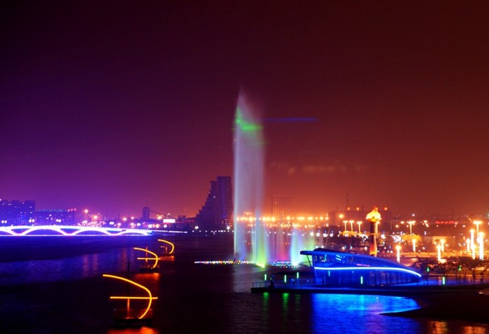 太陽廣場,占地9萬平米,最多可容納觀眾3萬人,中國水上運動會開幕式在這里舉行。廣場以“水”為創(chuàng)作元素,西部入口處是一個圓形噴泉;中間是一條蜿蜒曲折的溪流水景帶,溪流上建有幾座設(shè)計別致的小型景觀拱橋,溪流帶中間安放6組水上運動造型的鑄銅雕塑;廣場兩側(cè)各有兩組燈光廊架,白天是造型別致的雕塑,夜晚是絢麗多姿的燈光景觀。太陽廣場東側(cè)環(huán)抱水域中的是水中舞臺,有百米地下通道與舞臺水中地下室相通;舞臺東側(cè)是大型音樂噴泉,這是目前我省最大的音樂噴泉,也是國內(nèi)為數(shù)不多的大型海水音樂噴泉之一,它有十多種水型變化,噴泉長112米,最大寬度為70米,主噴噴射高度達80米,是全國為數(shù)不多的海水噴泉之一。噴泉下面設(shè)有浮排和浮箱裝置,可以根據(jù)需要自由升降,配合燈光變幻,造型萬千,美不勝收。南端是一組彰顯海洋文化和水上運動特色的文化景墻,幾十座景觀照明燈在廣場中間赫然而立,盡顯雍容華貴。左側(cè)臨水處是幾組伸向瀉湖水中的瀕水大臺階,整齊流暢、恢宏大氣。