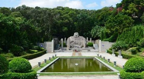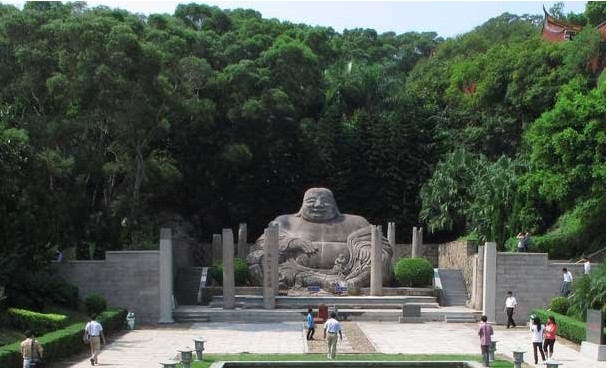 彌勒巖山麓,有一高大石佛盤膝而坐,這就是名聞遐邇的彌勒石雕造像。石佛像始鑿于元至正年(公元1341年),至明洪武年(公元1368年)竣工,高6.8米,寬8.9米,由整塊花崗巖就地琢成,天然妙相,袒胸露腹,兩耳垂肩,笑態(tài)可掬,觀者可以忘憂。經國家文物局認定,該石佛為全國最大的立體石刻彌勒佛像,已納入國家級文物保護單位。