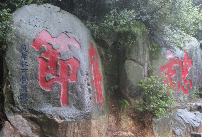 北宋大書法家蔡襄等題名“邵去華,蘇才翁,郭世濟(jì),蔡君謨,慶歷丙戌(1046年)孟秋八日游靈源洞”,為全山最早的石刻。“喝水巖”為宋嘉祐六年(1061年)施元長所題;二段“國師巖”題刻分別為宋蔡襄和慶歷進(jìn)士陳襄所題。刻在靈源洞蹴鰲橋下深澗巖壁上的“壽”字,楷書,字高4.15米,寬3.05米,是福建省最大的古代摩崖石刻之一。在橋下西南側(cè)巖壁刻有“頑石點(diǎn)頭”佛像,像高2.45米,手捧經(jīng)卷,趺坐蒲團(tuán)。在觀音閣東側(cè)石門巖上,刻有郭沫若于1962年11月游鼓山涌泉寺詩:“節(jié)屆重陽日,我來訪涌泉。清風(fēng)鳴地籟,凝雨濕山川。浮嶺多松柏,依崖有杜鵑。考亭遺址在,人跡卻蕭然。”