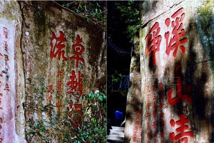 自宋以來,名人筆跡薈萃于此,共有石刻549段。其中宋刻89段,元刻11段,明刻31段,清刻168段,民國刻96段,中華人民共和國刻2段,另有疑刻152段。主要分布在靈源洞、石門、達(dá)摩十八景、絕頂峰、白云洞等處。靈源洞是全山摩崖石刻最集中處,有宋以來的真、行、草、隸、篆書體的題刻100多段,被譽(yù)為“東南碑林”。