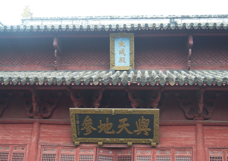 下泮橋即至大成門。此門系門廳式梁森構(gòu)架,闊三開間。硬山到頂,筒瓦頂蓋,正脊兩面三刀端裝飾鰲魚,四角凌空飛翹。門廳前后之間設(shè)壁隔內(nèi)外廳,并列辟門三道,中門屹立一對石獅,兩邊側(cè)門各置兩只石鼓。毗連門兩面三刀側(cè)的崇圣祠、土神祠、各三間,坎墻上軒要格通窗。廳、祠并列相依,刪繁脫俗,獨(dú)具匠心。