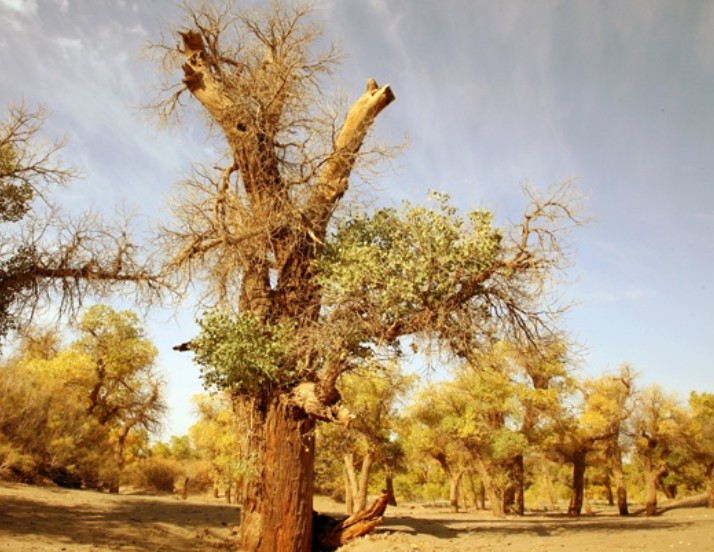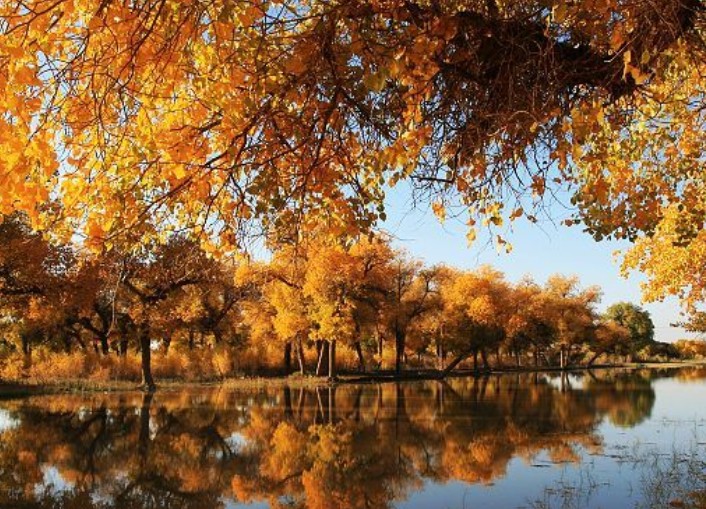 內(nèi)蒙古阿拉善盟的額濟(jì)納旗,現(xiàn)有天然胡楊林45萬(wàn)畝,是世界僅存的三大胡楊林之一,是國(guó)家自然保護(hù)區(qū)和國(guó)家森林公園。胡楊林是一個(gè)古老的樹(shù)種,被譽(yù)為“植物活化石”,有“生一千年不死,死一千年不倒,倒一千年不朽”的美譽(yù)。胡楊,又名“梧桐”,為古地中海殘遺物種,屬落葉喬木,蒙古語(yǔ)稱為“陶來(lái)”。胡楊木質(zhì)纖細(xì)柔軟,樹(shù)葉闊大清香,耐旱,生命力頑強(qiáng),是自然界稀有的樹(shù)種之一。金秋十月,額濟(jì)納是一個(gè)童話般的世界。胡楊金葉掛滿枝頭,細(xì)細(xì)看來(lái),在樹(shù)枝間竟尋不到一片異色葉子,密密匝匝,金光燦爛,至純至美;遠(yuǎn)遠(yuǎn)望去,一片片金色的胡楊把大漠裝點(diǎn)得如詩(shī)如畫,匯集成金色的海洋,吸引著大批國(guó)內(nèi)外賓客到此旅游、采風(fēng)、攝影。