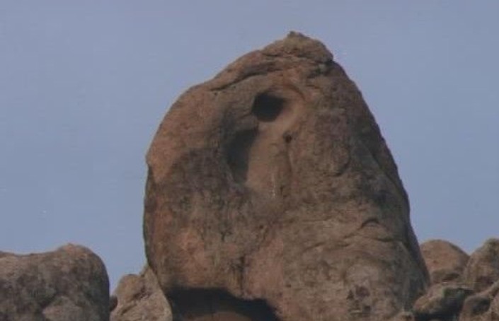 腳下的沙原不時(shí)裸露石頭的底色,一塊塊突起,應(yīng)著蒼天。這就是神石溝的石齦。石頭上凹陷的地方汪著雨水,水里流走著藍(lán)天白云,微風(fēng)掠過,水汪里蕩開幾紋水波,白云藍(lán)天在水汪里褶皺。突然內(nèi)心深處生出來想喝這些雨水的欲望,很強(qiáng)烈,意識(shí)決定行動(dòng),身子俯下,水影里的藍(lán)天白云被擠走,才發(fā)現(xiàn)水的底部竟然有幾粒被雨水浸泡的膨脹了,還泛著微白的羊糞蛋。它們的出現(xiàn),戛然遏止了我的欲望。 神石溝就到了,反映在腦際的依然是神奇,是現(xiàn)實(shí)的神奇,乃至驚異。我斷然決定這不是“溝”,是“海”,是石頭的海洋。看那爿爿石浪,簇?fù)碇碇拇蛑肯蛱祀H。再看石海憤怒了,驚濤萬丈,拔石成峰;時(shí)而舒緩,平和,鼓蕩著浪花,一浪推一浪,一浪裹一浪。