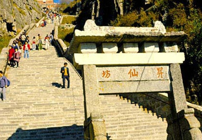 升仙坊位于山東省泰山中路緊十八盤的起始處,為兩柱單門式石坊,額題楷書“升仙坊”。此處山勢陡峻,懸崖峭壁,上臨岱頂天庭,咫尺仙境,似有飄然升仙的意境,故名“升仙坊”。游人至此小憩,每每浮想聯(lián)翩。回視山下,常有騰身云霄之感,舉首仰望,南天門近在眼前,奮力攀登,岱頂在望。 升仙坊位于南天門下。全石雙柱單門式,寬2.82米,通高4.5米,建于雙層方 石基上。基石長1.82米,寬0.64米,高0.5米。柱方形,下施滾墩石,獸頭石鼓狀。