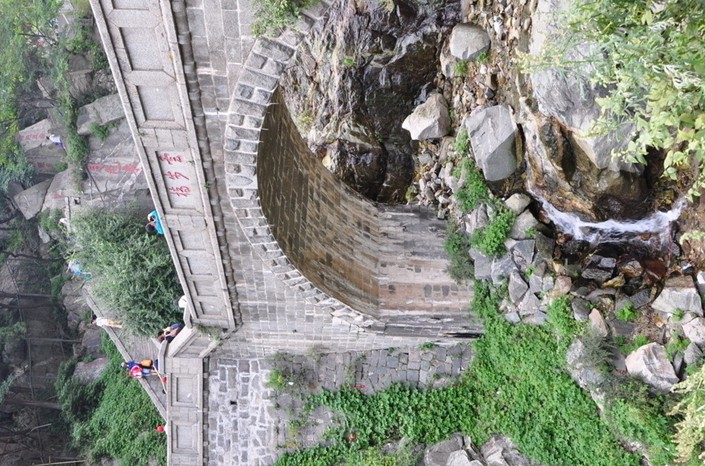 無論云步橋如何變化,云步橋景點的美麗是亙古不變的。明代陳鳳梧便有詩贊賞當時的“云步橋”:“百丈崖高鎖云煙,半空垂下玉龍蜒。天晴六月常飛雨,風靜三更自奏弦。蒼水佩懸云片片,珠簾洞織月娟娟。晚山倒著肩輿下,回看斜陽景更艷。”云步橋北壁立如削,崖上石坪坦豁,傳宋真宗曾在此駐蹕,因名御帳坪。岱頂下諸水奔流而來,聚此處飛瀑下瀉,濺沫迸珠,生云化霧,蔚為壯觀,故又名飛瀑巖、天河、護駕泉。崖上有“紅橋飛瀑”、“霖雨蒼生”、“河山元脈”、“太古清音”等題刻。橋東有酌泉亭,又名觀瀑亭,是清末一泰安知縣所建。北側(cè)有聯(lián)“且依石欄觀飛瀑,再渡云橋訪爵松。”橋周圍有“月色泉聲”“云步躋天”、“氣象巖巖”等題刻50余處,真、草、隸、篆諸體薈萃,琳瑯滿目。