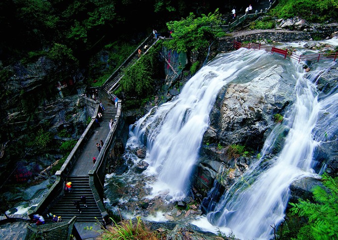 位于“斬云劍”北側(cè),是跨中溪而建的一座單孔拱形石橋。橋畔常有云氣彌漫,人行橋上,宛在天際,故名“云步橋”。橋北有大片陡峭的石崖,題刻遍布,飛瀑直下,景色絕佳,是游人駐足小憩的天然所在。東有清代建的“酌泉亭”一座,亭為石作,內(nèi)外鐫滿楹聯(lián)和詩文,游人可從這些石刻中,領(lǐng)略偉大的中華精神,升華心靈世界。