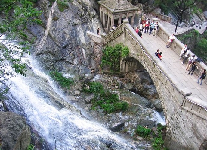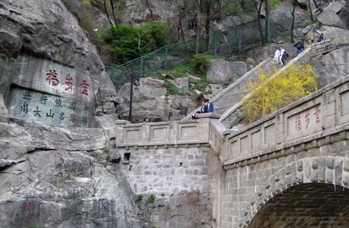 泰山旅游景點之一:在快活三里北首的云步橋,原來是木橋,叫雪花橋,民國年間改建石橋。這里林木茂盛山谷深幽,常為云霧籠罩,因此楊承訓題名“云步橋”。
