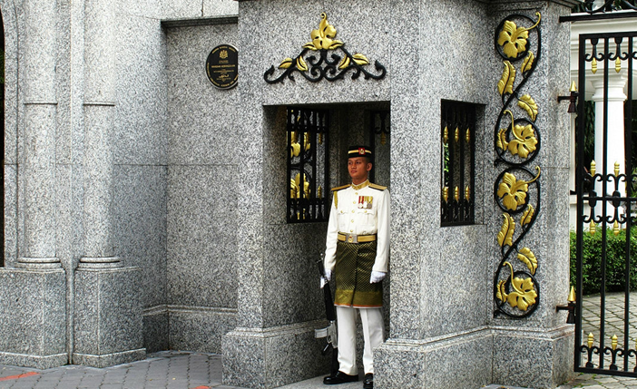 國(guó)家皇宮坐落在吉隆坡的一座小山丘上,雖沒有其他大國(guó)的皇宮建筑的宏大氣派,但卻有著皇宮一如既往的輝煌與莊嚴(yán)。在平常的時(shí)期,皇宮并不對(duì)外開放,所有的游客只能在皇宮門口欣賞整個(gè)皇宮的華麗。簡(jiǎn)單的皇宮門口是由一扇并不是很寬敞的鐵門與旁邊的小崗?fù)づc小門洞組成。僅僅就這一小片風(fēng)景,就讓游客迷戀不已。