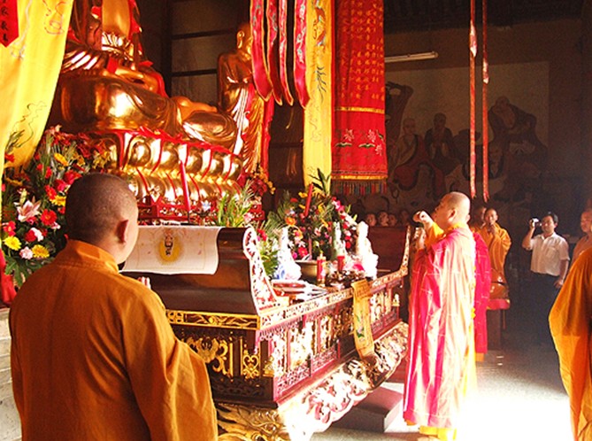大雄寶殿是法華院的主體建筑,它依山面南而座,殿內(nèi)供奉佛祖釋迦牟尼,因他大智大勇,無敵于邪惡,故人們尊稱其為“大雄”。“大雄寶殿”四個大字為原全國佛教協(xié)會會長趙樸初先生所題。立于佛祖兩旁分別是他的兩個弟子大迦葉和阿難尊者 。大殿東、西、北三面墻壁繪有文殊菩薩、普賢菩薩和十八羅漢,壁畫描繪的生動、精美。