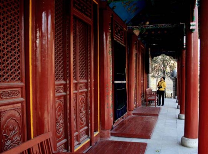二門是單檐硬山式建筑,面闊三間,建筑面積四十五平方米。中柱五十多公分,六扇朱漆大門,檐頭雕刻伊斯蘭教經(jīng)文和圖案,工藝精湛。門內(nèi)南北兩扇墻上,鑲有四塊石碑,記述該寺歷史修二門記和禮拜時(shí)辰。三個(gè)大門上面均有匾額,正中是明成化丙戌科進(jìn)士劉瓚題字“開天正教”; 版權(quán)所有山東聊城聊之旅國(guó)際旅行社有限公司,轉(zhuǎn)載必究!右為清代鎮(zhèn)守山東登州等地的總兵官軍提督密勇巴圖魯馬建紀(jì)題字“默德真?zhèn)?rdquo;,左為清康熙二十三年掌教趙璜、張養(yǎng)心、劉翰美題字“瞻天仰圣”。現(xiàn)存二門為乾隆二十年重修。
