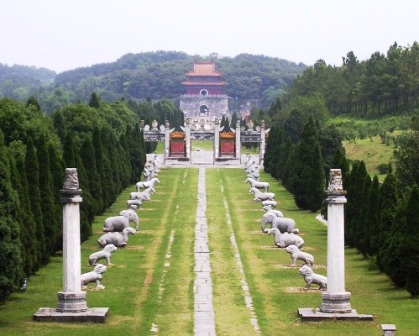 石雕群 是陵前放置的石雕人、獸,古稱石像生(石人又稱翁仲)。從碑亭北的兩根六角形的石柱起,至龍鳳門止的千米神道兩旁,整齊地排列著24只石獸和12個石人,造型生動,雕刻精細,深為游人所喜愛。其數(shù)量之多,形體之大,雕琢之精,保存之好,是古代陵園中罕見的。石獸共分6種,每種4只,均呈兩立兩跪狀。將它們陳列于此,賦有一定含義。例如,雄獅威武,而且善戰(zhàn);獬豸為傳說中的神獸,善辨忠奸,慣用頭上的獨角去頂觸邪惡之人。獅子和獬豸均是象征守陵的衛(wèi)士。麒麟,為傳說中的"仁獸",表示吉祥之意。駱駝和大象,忠實善良,并能負重遠行。駿馬善于奔跑,可為坐騎。石人分勛臣、文臣和武臣,各4尊,為皇帝生前的近身侍臣,均為拱手執(zhí)笏的立像,威武而虔誠。在皇陵中設(shè)置這種石像生,早在兩千多年前的秦漢時期就有了。主要起裝飾點綴作用,以象征皇帝生前的儀威,表示皇帝死后在陰間也擁有文武百官及各種牲畜可供驅(qū)使,仍可主宰一切。