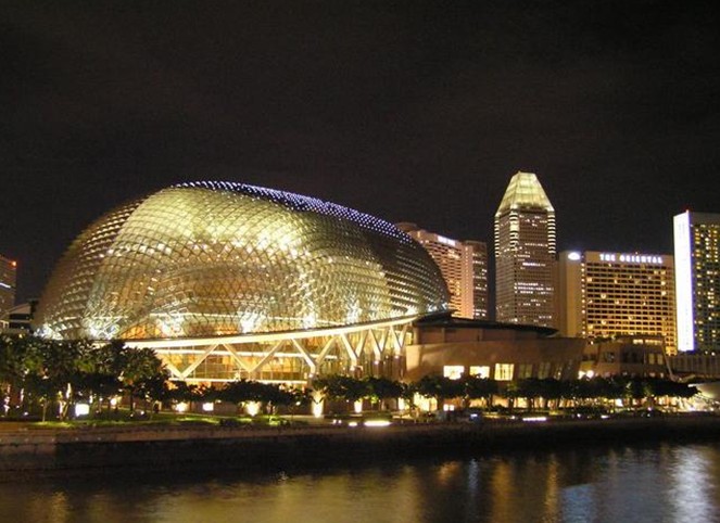 濱海藝術(shù)中心(The Esplanade),于2002年10月落成,是新加坡的地標(biāo)建筑。外型奇特突出,宛若兩顆榴蓮,因此得名榴蓮藝術(shù)中心。但實質(zhì)上建筑師的靈感是采掘,根據(jù)蜻蜓的復(fù)眼來設(shè)計的。一開始可能感覺不到,當(dāng)你看了濱海藝術(shù)中心的全景之后,可以越來越清晰地感到作者的想法及模仿蜻蜓復(fù)眼的逼真了。濱海藝術(shù)中心不僅外觀獨(dú)特,建筑物蘊(yùn)含了不少的科學(xué)計算。它是由4,590片玻璃所組成的屋頂遮陽罩,依據(jù)新加坡日照環(huán)境的模擬計算設(shè)置。其內(nèi)部陳設(shè)卻充滿歐洲劇院風(fēng)味,功能多元化,包含音樂廳、戲劇院、購物中心、餐廳及戶外表演空間等,讓東方與西方的藝術(shù)文化在此撞擊出最美的火花。