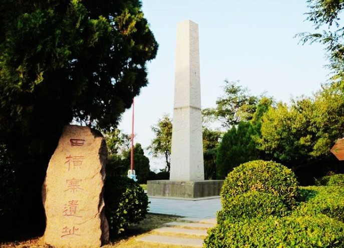 這里是田橫寨遺址,為長方形,東西長120米,南北寬80米。南側(cè)的“田橫寨遺址”石碑為書法家大康題寫。這座田橫紀(jì)念柱高7米,采用花崗巖雕鑿而成。四面浮雕分別表現(xiàn)了“聚事”、“演練”、“進(jìn)攻”、“建國”四個場面。西側(cè)是一座田橫雕像。他面北而立,氣宇軒昂,象似在高呼“吾豈能北面而事臣?”雄姿凜然,氣壯山河。