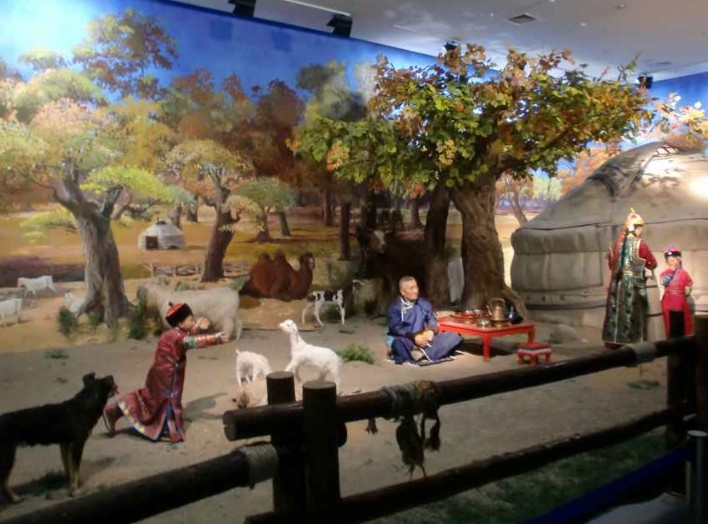 博物館阿拉善民族民俗展廳,建筑面積1300平米,展有款式多樣的阿拉善蒙古族服飾、代表禮儀至尊的阿拉善烤全羊、聞名遐邇的阿拉善蒙古族養(yǎng)駝馴駝技藝、工藝精湛的阿拉善仿古地毯、悠揚綿長的長調(diào)民歌、英武雄健的沙力搏爾式摔跤和神奇精湛的阿拉善蒙醫(yī)蒙藥等139件裝飾實物和民間藝術(shù)品。