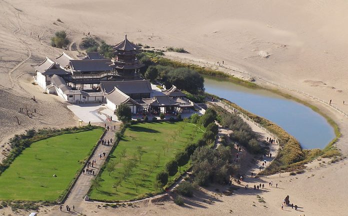 五十年代測量,月牙泉東西長218米,中斷最寬處54米,平均水深5米,最深處7米余。南岸原有廟宇百余間,但十年動亂中焚毀,農(nóng)業(yè)大躍進(jìn)時(shí)又抽水灌田導(dǎo)致池面嚴(yán)重縮小。近年修復(fù)古建、掏泉疏水、治沙綠化,才有今天面貌。臺灣易經(jīng)研究專家張淵量博士1993年游河西時(shí)根據(jù)易經(jīng)、易理考證認(rèn)定月牙泉即王母娘娘蟠桃盛會之瑤池也,信否隨意。