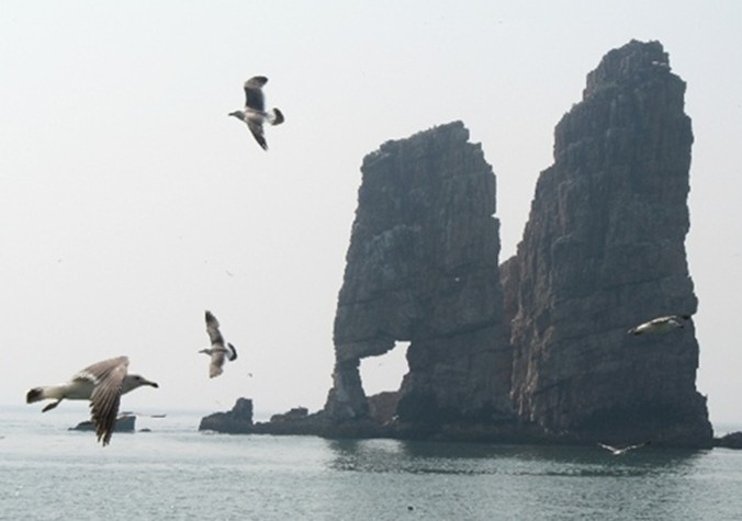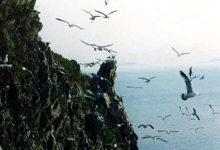 萬(wàn)鳥島坐落于長(zhǎng)島諸島中部偏東,這個(gè)海拔73.5米、僅有0.05平方公里的小島,在浩渺的汪洋大海之中,簡(jiǎn)直是一粒微不足道的沙粒,然而海深魅力大,島小情趣多,因島上棲居著幾萬(wàn)只黑尾鷗、海鸕鶿、白腰雨燕等海鳥,后稱萬(wàn)鳥島。海岸地貌懸崖陡壁占90%以上,斷崖系石英巖與板巖互層,節(jié)理發(fā)育,破碎性強(qiáng),經(jīng)千百年風(fēng)化和海蝕,崖壁此凸彼凹,石階、石臺(tái)、石窟、石穴鱗次櫛比,形成一座自然的“海鷗石樓”。每年四、五月間,成千上萬(wàn)只海鷗在此安家,覓食、嬉戲、休憩、生兒育女。這時(shí)的小島變成了喧囂的鳥國(guó)、沸騰的劇場(chǎng)、海鷗的天堂。