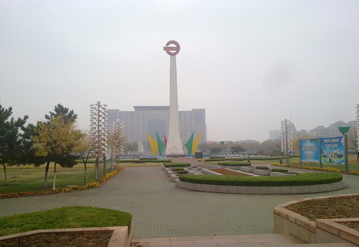 天地廣場(chǎng)位于煙臺(tái)經(jīng)濟(jì)技術(shù)開發(fā)區(qū)中心,北臨長(zhǎng)江路,南接珠江路,占地24萬平方米,1994年開工建設(shè),1998年竣工開放。廣場(chǎng)以綠為基調(diào),突出自然植物主體,點(diǎn)綴雕塑、小品等人工景物。中軸線將廣場(chǎng)分成南北兩個(gè)觀賞群,以表達(dá)天地廣場(chǎng)的含義。北為與“天”有意的“太陽(yáng)”廣場(chǎng),中心向外采用放射狀道路,以形似陽(yáng)光,南為與“地”有意的“大地”廣場(chǎng),中心圍以規(guī)劃的環(huán)狀道路,以形似大地。
