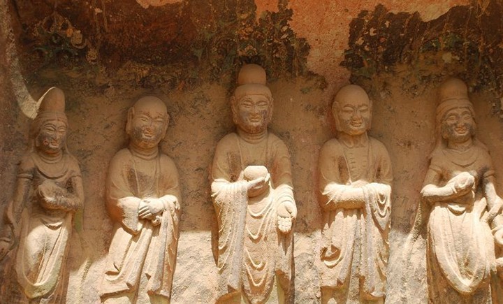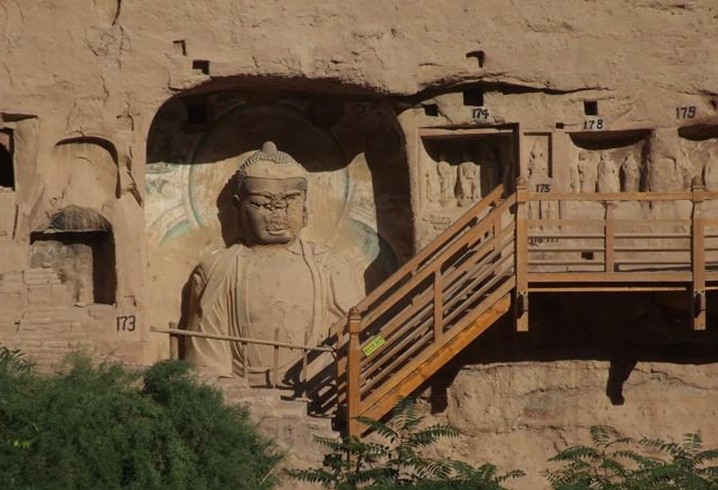 此后,由于窟內幾無平整的巖面,大多依巖勢鑿□孔設□樁,用木料及編織荊條為骨架然后施泥涂堊而成背屏式龕,于其中造像。有的還置木板為龕底。版權所有山東聊城聊之旅國際旅行社有限公司,轉載必究!佛龕因地制宜,形式靈活,題材和內容也趨于多樣。最重要的第6號龕,高1.7米,深0.76米,寬1.5米,塑一佛二菩薩,榜題標明為無量壽佛和觀世音、大勢至菩薩。坐佛形體健碩,面形方圓,神情剛毅。龕側墨書題記1方,高0.47米,寬0.87米,末尾題:“建弘元年歲在玄枵三月廿四日造”,可知該龕為420年造。但是,若依星歲紀年玄枵,則相當于建弘五年(424)。這是迄今發(fā)現(xiàn)中國石窟最早的紀年題記。窟內一批風格相同、敷泥層次相同的龕像和壁畫可據(jù)此判定為同時期的作品。題記下方壁畫供養(yǎng)人數(shù)排,為首者題名“□國大禪師曇摩毗之像”、“比丘道融之像”等,是文獻記載中的當時著名高僧。第9號龕3身立佛,塑造時間略有早晚,但大體稍早于第6號龕。第7號龕稍晚于第9號龕,主要殘存1立佛。正壁下部第17號龕,主像原為一佛二菩薩立像,現(xiàn)僅存右側菩薩,寶繒束發(fā),形象古樸,亦應早于第6號龕。第17號龕下部半跏菩薩思維像,低頭含笑,表現(xiàn)出了悟之時的喜悅心情,是早期造像中的精品。南壁第23號龕并列5身禪定坐佛約與第6號龕同時,均著通肩袈裟,版權所有山東聊城聊之旅國際旅行社有限公司,轉載必究!陰刻線衣紋均由左肩斜下展開,明顯受到了西域造像的影響。略晚的作品如南壁下部的5身坐佛(第20號龕),均作禪定印,大小不一,中間一身為釋迦苦修像。第6號龕內和龕東側壁面(第11、12、13號龕)以及窟口南側上方巖壁上(第24號龕),保存了至今僅見的西秦壁畫,內容有說法圖、維摩詰變、無量壽佛、釋迦多寶佛、彌勒菩薩及十方佛、千佛、飛天、伎樂、供養(yǎng)人等,畫風雖質樸、粗獷,卻清新、自然、生動。西秦造像的另一重要作品,是位于窟龕群南端的第1窟石胎泥塑立佛。
