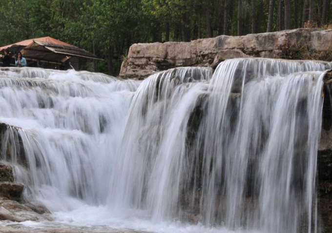 從這里往下游不到一里地,是“土泉瀑布”,它是峨莊瀑布群中最大的一個(gè)瀑布。巨大的水流從十幾米高的壩上泄到河岸的亂石上,激起的浪花又形成了許多樣式不同、大小不一的瀑布,最后跌落在山谷里。這些瀑布因自然地勢(shì)不同上承下接,形成了層層疊疊的小瀑布,連成一片,大珠小珠落玉盤,非常壯觀。這里是吸引游人最多的地方,為了便于觀賞,在下邊的河谷中建起了三個(gè)觀瀑亭,站在觀瀑亭上抬頭望去,還真有點(diǎn)“遙看瀑布掛前川”的味道。