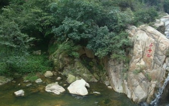 王母池位于山東省淄博市博山區(qū)山頭鎮(zhèn)樵嶺前村南。村西有一條長(zhǎng)約5公里的變質(zhì)巖山谷,兩山夾峙,危巖峭壁,樹木蔥郁。