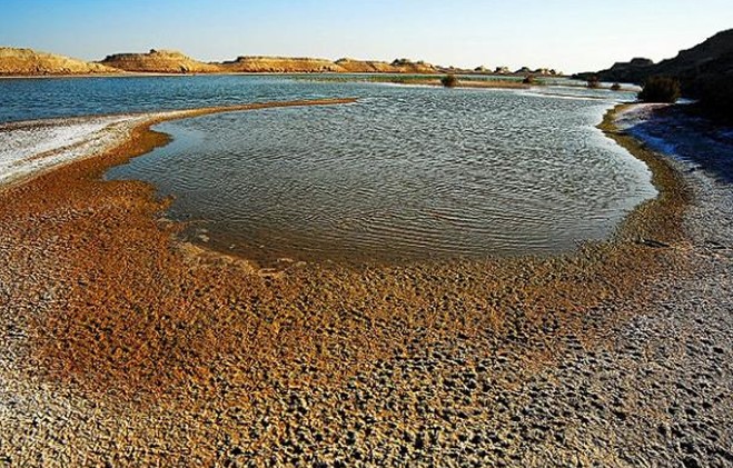 羅布泊“地下死海”主要分布在東北部的涸湖盆地底,表面是堅硬的鹽殼,當(dāng)挖一個2m米深的洞穴后,就可看見“地下死海”的真面目。用棍棒觸攪穴中水后,提離水面都會結(jié)上一層白色的鹽晶體。與死海不同的是,這里的水深藏在巖石或土層縫隙中,鑿開一洞穴后,水就嘩嘩涌集一起。