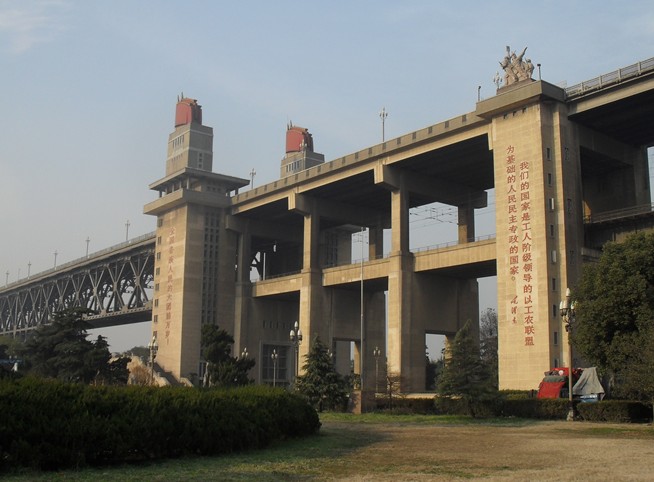 橋的南北各有一對(duì)橋頭堡,高為70米,橋頭堡上各有三面紅旗,象征著50年代的人民公社、大躍進(jìn)和總路線(xiàn)。橋頭堡前還各有一座高10余米的工農(nóng)兵等五人雕塑,為當(dāng)時(shí)中國(guó)社會(huì)的5大組成部分,即工、農(nóng)、兵、學(xué)、商,具有典型的文革文藝風(fēng)格。在橋頭堡堡身周?chē)逃?ldquo;全世界人民大團(tuán)結(jié)萬(wàn)歲”等浮雕。版權(quán)所有山東聊城聊之旅國(guó)際旅行社有限公司,轉(zhuǎn)載必究!三面紅旗的橋頭堡在建成后,風(fēng)靡全國(guó),被多次模仿,而且在60-80年代成為南京的城市標(biāo)志之一,一直到今天南京長(zhǎng)江代大橋橋頭堡仍然是著名旅游景點(diǎn)。