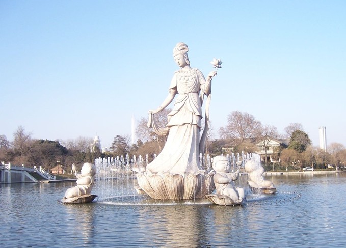 從玄武門開始,一條形如玉環(huán)的陸地,從南北兩面深入湖中,即為環(huán)洲。步入環(huán)洲,碧波拍浪。細(xì)柳依依,微風(fēng)拂來,宛如煙云舒卷,故有“環(huán)洲煙柳”之稱。洲南端假山瀑布盡顯江南園林美感,石峰中有形似觀音的觀音石,是宋代花石綱的遺物。過觀音石,有東晉文學(xué)家郭璞的衣冠冢。洲北岸蓮花港畔有喇嘛廟、諾那塔、湖光塔影,獨(dú)具幽情。湖上還有月季園、兒童樂園、兒童友誼樂園、登月火箭等游樂點(diǎn)。