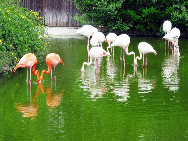 火烈鳥(niǎo)展區(qū)位于正大門口,共展出88只火烈鳥(niǎo),有迎賓小姐的美稱,紅色的是美洲火烈鳥(niǎo),粉紅色的是歐洲火烈鳥(niǎo)。它們有“Z”字形的長(zhǎng)頸和鐮刀形的長(zhǎng)嘴。此外它們還有一雙蜘蛛般的長(zhǎng)腿,顏色發(fā)紅。它們有著獨(dú)特的淡朱紅色的羽毛。遠(yuǎn)遠(yuǎn)看去宛如一團(tuán)火球。所以又有“火鶴”之稱更奇特的是無(wú)論它們的羽毛如何美麗,一經(jīng)拔下就變成白色。它們的嘴和眼也生的與眾鳥(niǎo)不同:嘴細(xì)長(zhǎng)彎曲向下,色多淡紅,基部為黃色,眼睛又細(xì)又瘦,與它們那龐大的身軀很不協(xié)調(diào)。
