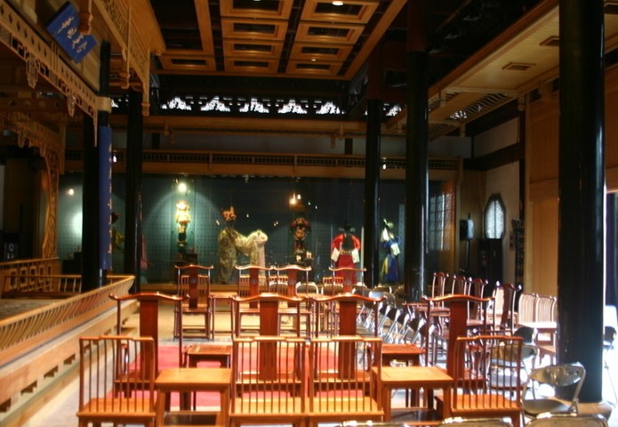 在原全晉會(huì)館大殿內(nèi)建造了一室內(nèi)戲臺(tái),使大殿成為一室內(nèi)戲廳。該戲廳是昆博昆曲展演的主要場(chǎng)所,觀眾席復(fù)原明式廳堂陳列、明式家具、匾額、對(duì)聯(lián)、鋪上紅氍毹,組成明代廳堂紅氍毹演出形式。此廳既是向觀眾展示古代昆曲傳統(tǒng)的演出形式,同時(shí)也是作為曲友拍曲清唱的場(chǎng)所。在室內(nèi)戲臺(tái)兩側(cè),陳列展出昆曲服飾(包括服裝、盔帽、髯口、面具、臉譜及各種道具),該室內(nèi)戲廳充滿強(qiáng)烈的舞臺(tái)演出氛圍。