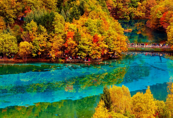 因溝內(nèi)分布著9個藏族村寨而得名,海拔2000~3000米,屬高山深谷碳酸鹽堰塞地貌,以翠海(高山湖泊)、疊海、彩林、雪山、藏情“五絕”馳名中外,被譽為“夢仙境”和“童話世界”。主景長沙有六公里,面積6萬多公頃,有長海、劍巖、諾日朗、樹正、扎如、黑海六大景觀,呈“Y”字形分布,以水景最為奇麗,泉、瀑、河、灘將108個海子連綴一體,碧藍澄澈,千顏萬色,多姿多彩,“水在樹間流,樹在水中長”,有“黃山歸來不看岳,九寨歸來不看水”和“世界水景之王”之稱。