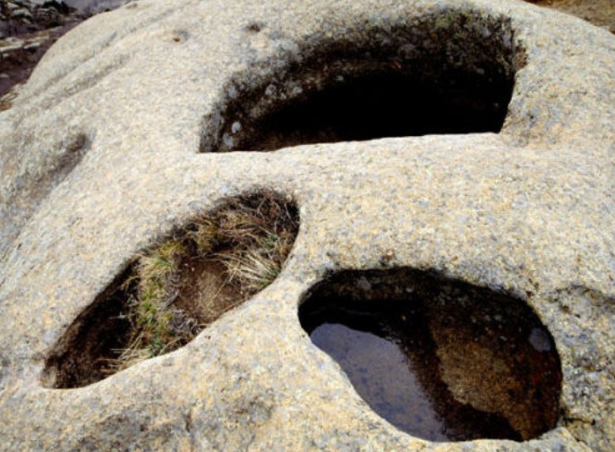 青山自然保護(hù)區(qū)位于海拔1574米的青山山體上,在山頂頂峰分布著各種各樣的冰臼,其平面上多數(shù)呈圓形、近圓形、橢圓形和不規(guī)則的形狀。有的象葫蘆,有的象梅花,有的象瓜子。一般冰臼口稍小,中下部較大,底多較平或呈鍋底微凹。形體“似臼”、“似盤”、“似盆”、“似匙”等,可以說應(yīng)有盡有。其中較深的冰臼多呈口小、肚大和底平特征。口部上緣帶有缺口(或開口),缺口有大有小,有深有淺。一般臼口寬約0.3~2米,深0.1~2米左右。最大的直徑達(dá)10.5米,深4.5米;最小的只有幾公分,似一般鈕扣大小。據(jù)調(diào)查統(tǒng)計,在方圓不到2平方公里的范圍內(nèi),就有大小不一的冰臼1000多個。有的冰臼光潔如洗,無任何殘留物和充填物,但很多冰臼中,都填滿風(fēng)塵黃土物質(zhì),已長滿花、草或喬木、灌木,形成大小不同的“天然盆景”,置于堅硬平坦的花崗巖山脊上,十分壯觀,給人極大的神奇感和奧秘感。