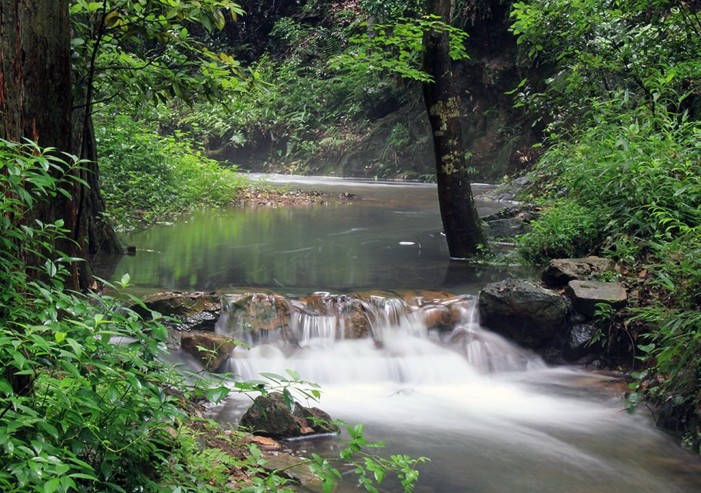 我沿這條溪流上行,是從龍井開始的。 溪流是流經(jīng)萬山叢中而來的。這些山并不陡峭卻很多溝壑,山腳相互交叉,樹木叢生,茂盛蒼翠,看不清上山的路徑。沿著溪流找山路,看見東邊又看不見西邊;前面象是路阻斷了,走上去卻發(fā)現(xiàn)有路。凡是水沒有流進溪的都叫做澗,一共有十八條澗,正好是九條溪的一倍。