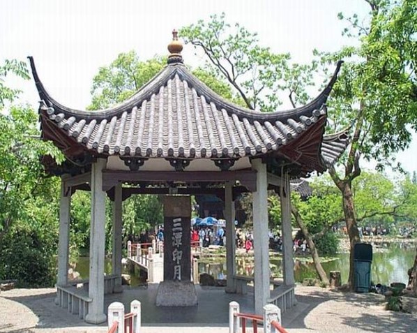 其一,所謂三潭,實際上是3個石塔和其周圍水域,石塔建于宋代元四年(公元1089年),每個高2米,分別矗立在水光瀲滟的湖面上,形成一個等邊三角形。小瀛州之南的湖面上是湖上賞月的極佳去處,水深若潭,月影幽深。