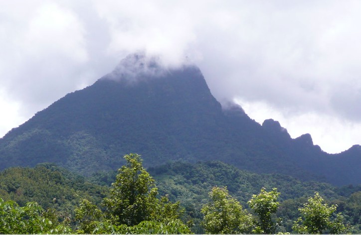 近看五指山,只見(jiàn)5個(gè)“指頭”由西南向東北,先疏而后密地排列。跟前那座郁郁蔥蔥的山峰,便是五指山第一峰,海拔1300多米,崢嶸壁立,那頂峰傾斜指著天際。在五指山區(qū)公所的所在地朝山上看,整座山峰好像一座碩大的金字塔,那山巔則像喙食尖削的鳥(niǎo)嘴,但是登上去后,卻是一大塊近10多平方米面積的巖石。