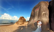 情人島,是經(jīng)歷了千百年潮起潮落洗禮卻依然矗立、靜靜相望的兩座大石。傳說是古時人們?yōu)榱思o(jì)念一對因相戀而被惱怒的龍王變成石頭的癡情戀人而起名的。現(xiàn)在這里成了蜈支洲島的一大景點,是青年男女耳語、聽濤的好地方。