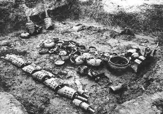 在距曾侯乙墓約500米的地方, 又發(fā)現(xiàn)了戰(zhàn)國時(shí)期的古墓群,初步查明為24座,出土文物200余件,主要是銅器、仿銅陶禮器和兵器, 尤以青銅劍為最多。據(jù)考證,這座墓群很可能是當(dāng)時(shí)的一個(gè)公族墓,即古文獻(xiàn)所說的“族墳?zāi)?rdquo;。