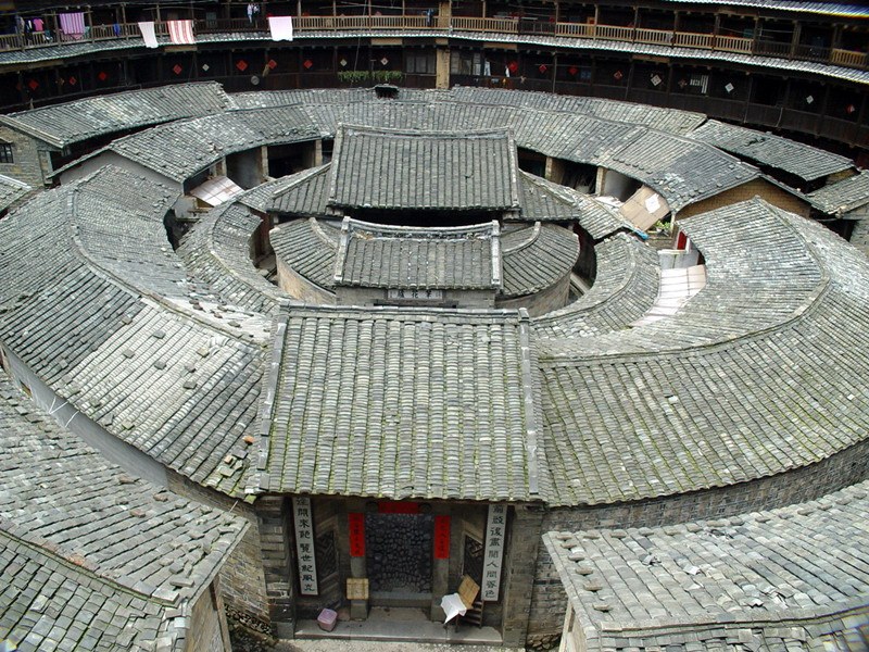 圓樓是當?shù)赝翗侨褐凶罹咛厣慕ㄖ话闼砸粋€圓心出發(fā),依不同的半徑,一層層向外展開,如同湖中的水波,環(huán)環(huán)相套,非常壯觀。其最中心處為家族祠院,向外依次為祖堂,圍廊,最外一環(huán)住人。整個土樓房間大小一致,面積約十平方米左右,使用共同的樓梯,各家風乎無秘密可言。