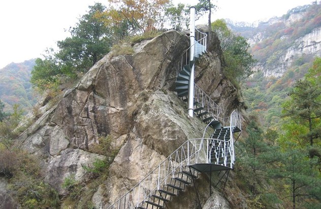 龍峪灣有紅幢溝、黑龍谷、青石峽、磨子壕、八間凹 、牛角窯、羚羊巢、斷山壕等幽谷20余條。云山廝磨,幽遠深邃,青嶂連空,極目無際。仰觀天象,煙嵐騰騰,如置身云海;俯瞰谷底,一線茫茫,覺怵目驚心。谷旁、澗邊多有怪石嶙峋,如人似獸,千姿百態(tài)。如“垂釣石”,站立河中,平面光潔,狀如臺桌,登其上可小憩觀瀑,著棋垂釣。距其 1米處,河中心有一層次分明的天然石塔,上臥石鳥,引頸望水,似觀魚蝦遨游,名“鸞鳥觀魚塔”。落葉松林盡頭,山門開處,怪石直矗,上坐彌勒,閉目合十,面壁入定,稱為“彌佛坐禪”。還有龍爪石、累卵石臥牛石、蒼鷹石、伏虎石、蛤蟆石、天柱石等皆以其形象而命名。
