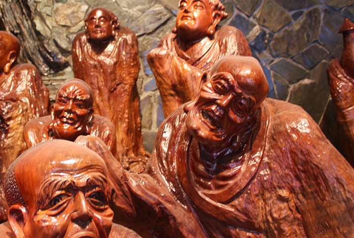 七、五百羅漢簡介:這套巨型根藝五佰羅漢,是徐谷青大師經(jīng)過十余年的精心準(zhǔn)備,花巨資收集全國各地千年龍眼木等根樁創(chuàng)作,風(fēng)格獨特,氣勢恢弘,既有佛的神秘,又與人生百態(tài)相映,他們?nèi)宄扇骸⒒蚪活^接耳、或悲或苦、或孤座獨立,或慈眉善目,或閉目凝神,全神貫注,妙相莊嚴(yán);有的胸腹袒露,似笑欲語;有的拄杖持珠,合十?dāng)偸郑械耐诙蟊牵煺鏍€漫,有的豐額寬肩,悠然自得;有的禿頭長耳,滿臉胡須;有的大腹便便,雙耳垂肩,有的捧腹搔耳,笑容可掬;有的誦讀經(jīng)卷,念念有詞;有的伸足屈膝,打坐箕踞…………,在傳統(tǒng)的雕刻技法中融匯了現(xiàn)代藝術(shù)的創(chuàng)新理念,使羅漢系列情表于外,意韻其中,典雅且通俗,使根雕藝術(shù)和佛教文化珠聯(lián)璧合,是世界上最大的一套根雕五百羅漢造像,正在申報世界吉尼斯世界之最,