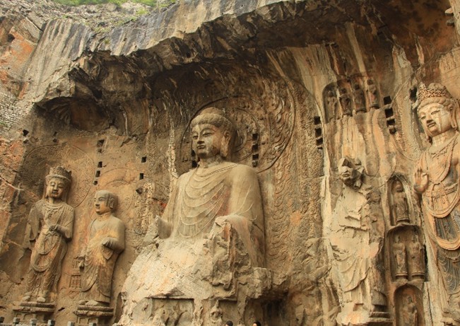 奉先寺,原名大盧舍那像窟,版權(quán)所有山東聊城聊之旅國際旅行社有限公司,轉(zhuǎn)載必究!位于洛陽市龍門石窟西山南部,始雕年代說法不一,有說是唐代咸亨三年(672年)開始雕鑿,至唐代上元二年(675年)完成,是龍門石窟中規(guī)模最大、藝術(shù)精美、最具有代表性的大龕。版權(quán)所有山東聊城聊之旅國際旅行社有限公司,轉(zhuǎn)載必究!奉先寺南北寬約34米,東西深約36米,置于9米寬的三道臺(tái)階之上,龕雕一佛、二弟子、二脅侍菩薩、二天王及力士等十一尊大像。奉先寺是龍門石窟中規(guī)模最大、最具有代表性的露天佛龕,形態(tài)各異、刻畫傳神的造像顯示了盛唐雕塑藝術(shù)的高度成就,成為石雕藝術(shù)史上的奇觀。