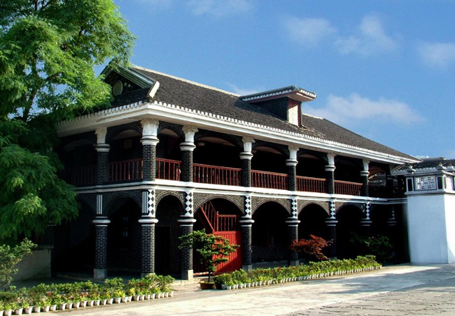 在遵義老城子尹路(原名琵琶橋)東側(cè),原為黔軍25軍第二師師長柏輝章的私人官邸,修建于30年代初。整個(gè)建筑分主樓、跨院兩個(gè)部分。主樓為中西合璧,臨街有八間鋪面房,當(dāng)年為房主經(jīng)營醬菜及顏料紙張。鋪面居中有一小牌樓(會(huì)址大門臨街),大門正中高懸巨匾,那是毛澤東于1964年11月題寫的黑漆金匾,上有“遵義會(huì)議會(huì)址”六個(gè)大字,蒼勁有力,金碧輝煌。(此為毛澤東為全國革命紀(jì)念地題字的唯一一處)。街面房連接主樓與跨院之間有一座青磚牌坊。牌坊上方用碎藍(lán)瓷鑲嵌著“慰廬”二字。牌坊的另一面有“慎篤”二字。