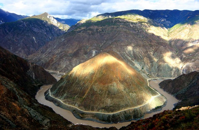 萬里長江從“世界屋脊”青藏高原奔騰而下,巴塘縣城境內(nèi)進入云南,與瀾滄江、怒江一起在橫斷山脈的高山深谷中穿行。到了中甸縣的沙松碧村,突然來了個100多度的急轉(zhuǎn)彎,轉(zhuǎn)向東北,形成了罕見的“V”字形大彎,“江流到此成逆轉(zhuǎn),奔入中原壯大觀”,人們稱這天下奇觀為“長江第一灣”。