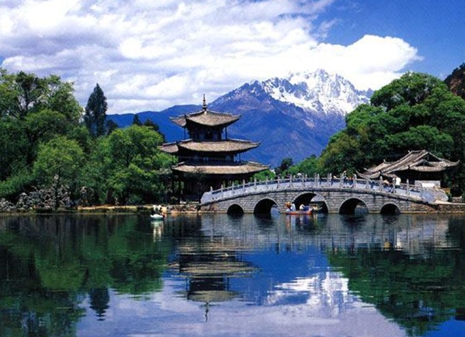 龍?zhí)队逞?以五孔橋、得月樓、雪山及黑龍?zhí)吨械难┥降褂敖M成的影像早已成為麗江的經(jīng)典風(fēng)光明信片,也成為游人在麗江拍照最多的取景之一。乍一看照片,沒(méi)到過(guò)麗江的人可能還會(huì)以為遠(yuǎn)處的玉龍雪山是黑龍?zhí)兜慕M成部分。黑龍?zhí)督?jīng)不斷擴(kuò)建后,今天已成為詩(shī)情畫(huà)意的山水園林,有南方頤和園之稱。