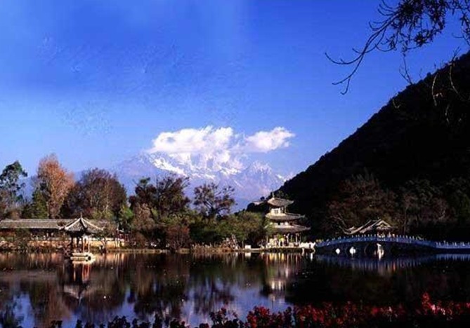 云南麗江黑龍?zhí)叮蝴惤邶執(zhí)队置袢珗@,位于城北象山腳下,從古城四方街沿經(jīng)緯縱橫的玉河溯流而上,約行一公里有一處晶瑩清澈的泉潭,即為中外聞名的黑龍?zhí)丁L端畯氖p間涌涌噴出,依山斛清泉匯成四萬(wàn)平方米潭面。四周山清水秀,柳暗花明。依山傍水造型優(yōu)美的古建筑點(diǎn)綴其間。其流韻溢彩,常引人駐足留連。